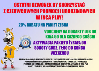 Ostatni dzwonek by skorzystać z czerwcowych promocji urodzinowych Inca Play! Promocja obowiązuje w weekendy od 21 czerwca do końca miesiąca...